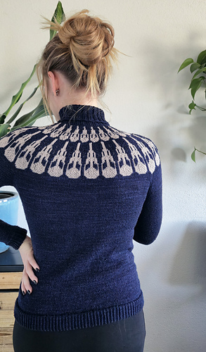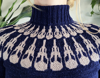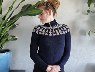 Tiny bird skulls form the colourwork neckline. The turtleneck and snug fit give it an elegant appeal.