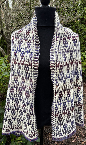 Raven’s Secret Garden Reader’s Wrap… curl up in a favourite chair with a favourite book and enjoy all the magic the comes from a great read. The lovely rustic yarn, Glenrosa DK, home grown in Mecthosin on Vancouver Island, which I purchased at the 100 Mile Fleece and Fibre event, adds generous texture to this wrap.