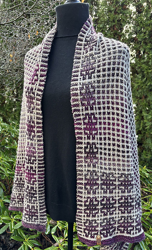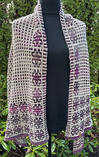 Raven’s Winter Reader’s Wrap… curl up in a favourite chair with a favourite book and enjoy all the magic that comes from a great read. A centre panel of garter slip stitch with accents of an all-around border of pretty motifs sets the stage for this lovely, warm wrap.
