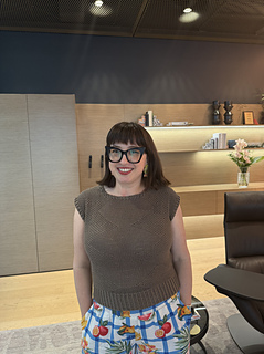Razzler is a classic sleeveless top, inspired by 1950s fashions. Knit in the round from the bottom up, it features a striking geometric seed stitch motif that’s as fun to knit as it is to wear!