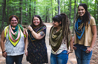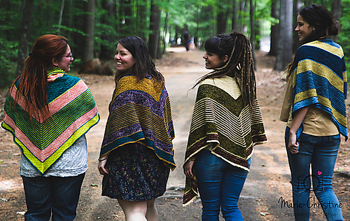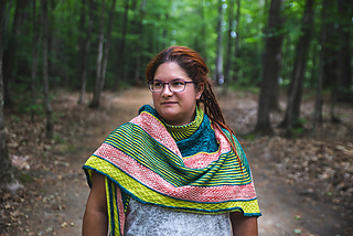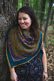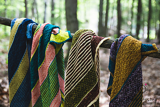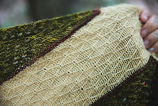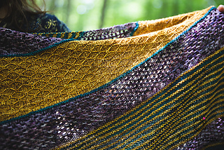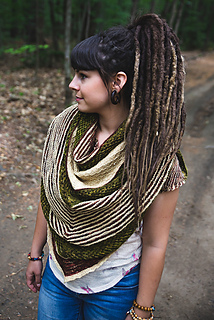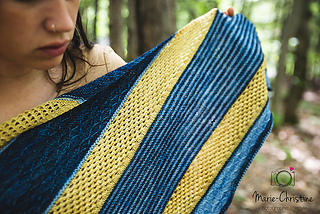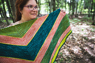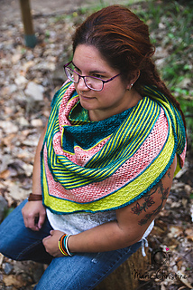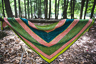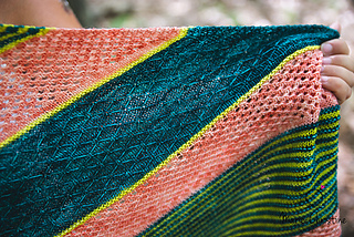 Rebirth est un châle triangulaire enveloppant. Les rayures qui sont une alternance de jersey et de point mousse donnent une texture au châle, en plus d’être accompagnés de dentelle et d’un point en treillis. Vous pouvez suivre les indications et le faire avec 3 couleurs ou bien suivre votre imagination et faire votre propre composition. La simplicité des points rend ce châle accessible.