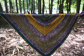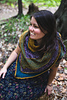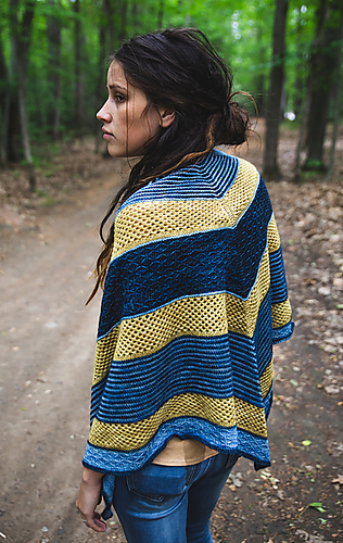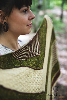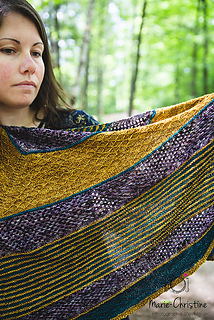 Rebirth is a wraparound triangular shawl. The stripes that are an alternation of jersey and garter stich give a texture to the shawl, in addition to being accompanied by lace and a treillis stitch. You can follow the directions and do it with 3 colors or follow your imagination and make your own composition. The simplicity of the points makes this shawl accessible.
