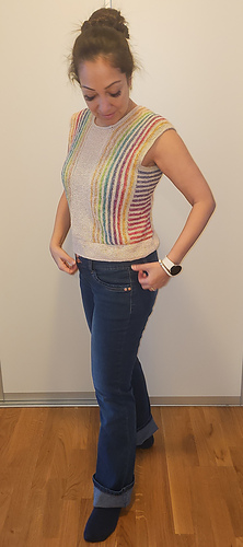 This pattern is beginner friendly, and great for using up leftover bits of fingering weight yarn. Testers have been knocking it out of the park with amazing color combinations and striping patterns. They have mixed different fiber contents throughout their pieces, and recommend experimenting with swatching to see how different fiber content behaves together. Some test knitters found they preferred to use softer fibers for sections in direct contact with their skin, such as the underarm panels and sleeve cuffs.