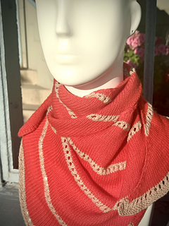 The color palette was inspired by a red and tan striped scarf I saw for sale online — I loved the color combination and wanted to reimagine it in a more elevated way as an asymmetrical triangle shawl worked in soft, luxurious yarn such as KAOS Soft Merino.