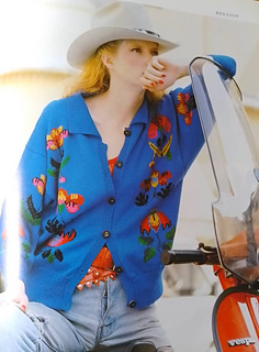 Pattern calls for 425 (450, 450) gm 4-ply of main colour royal blue; 75gm in dark blue; 50gm each in slate blue and black; 25gm each in Emerald, light blue, red, mustard, scarlet, lilac and fuchsia.