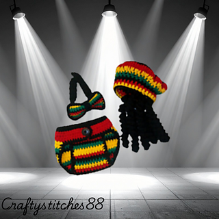Yeahhhh mon, even the tiniest of ones loved Bob Marley and his bright beautiful colors. Well now your little one or if your making that special gift for someone will too. This little outfit is beyond cute. The easy button up diaper cover, the bow tie that buttons around baby’s neck, adjusted for comfort. And of course the little one’s hat with dreadlocks. Can it honestly get any cuter. What a perfect outfit to take baby’s first pictures in. Bob himself would be proud. Pattern is written in US terminology and takes very little yarn. Great gift to give, or to sell.