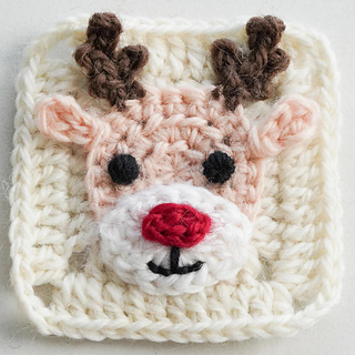 The reindeer’s face is crocheted directly into the base of the square, so they’re worked together as one piece. Then we separately crochet the antlers, ears, and that iconic red nose, and attach them to complete the perfect cute reindeer.