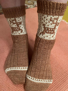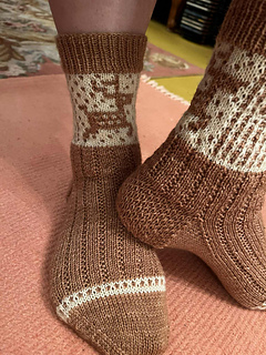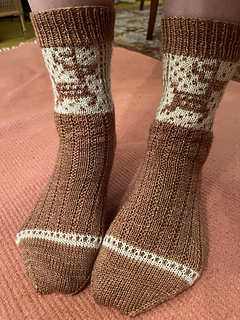 The “Reindeer” socks are worked cuff down with a reinforced heel, using the herringbone stitch.