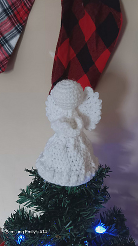 This pattern is crocheted in one piece from the head to the skirt using Red Heart Super Saver yarn (Medium [4]) and a 4 mm (G) crochet hook. You’ll need about 35 g (64 yds) of yarn, so one skein makes approximately 5 angels.
