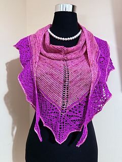 La construcción comienza desde el centro del cuello y crece de forma simétrica, combinando una amplia sección de punto bobo que aporta estructura y suavidad, con un calado delicado y expresivo que se despliega en el borde inferior. Este contraste resalta la forma del shawl y permite que el calado luzca especialmente bien al bloquearlo.