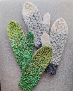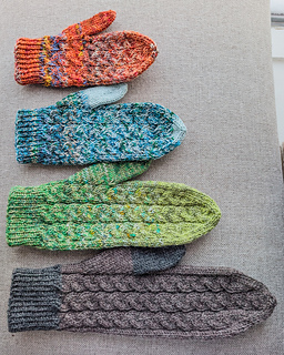 Til syvende og sist så er disse vottene designet for å bruke opp restegarn, i hovedsak tynt sokke-garn. Vi er nok flere som sitter igjen med noen gram etter å ha strikket er flott par med sokker eller et sjal i tynt sokke-garn, kanskje til og med flere. Om det er eksklusivt håndfarget eller kommersielt garn har ingenting å si. Mønsteret er designet for å strikke med 2 tråder fingering weight holdt sammen, eventuelt kun med en tråd i DK tykkelse. Så klart så må man ikke bruke det, så det ligger også med forslag til vanlig garn man kan bruke istedet. Bruk det du har, men jeg oppfordrer veldig til å bruke opp restegarn på disse.