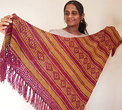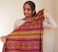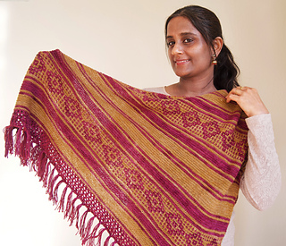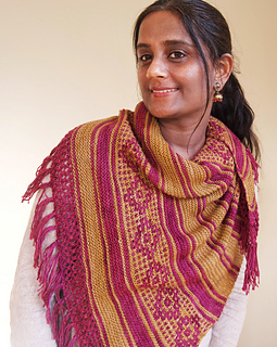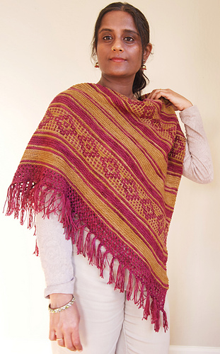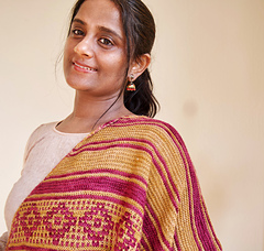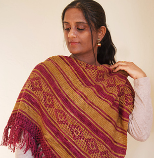 I was browsing through photographs from decades ago, wading through a flood of memories. I couldn’t help but notice the beautiful motifs and colors in the red oxide floors, the mosaic tiles, the curtains and cushions, and in the sarees worn by the women in my family. Inspired by those old homes, their retro decor, and my childhood there, this shawl is a gentle echo of those cherished times.