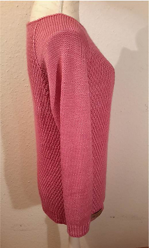 Vorderteil, Rückenteil werden mit einem Fantasiemuster und die Ärmel nur rechte Maschen in Runden gestrickt.