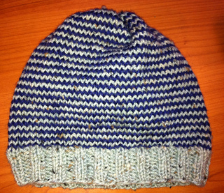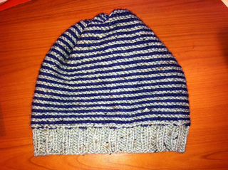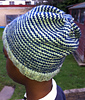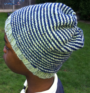 A reversible beanie hat with a slight slouch. Stripes are created by knitting helical stripes.