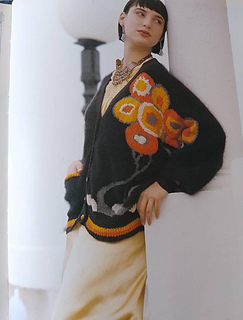 Pattern calls for Melinda Coss angora wool - 280gm black; Melinda Coss tussah silk yarn - 25gm each of orange, grey; 20gm each of gold, ecru and black. 6 buttons 1.5cm in diameter.