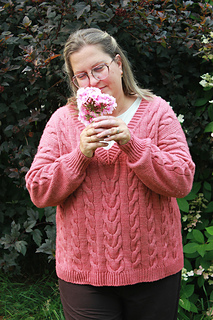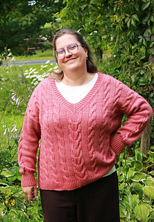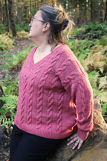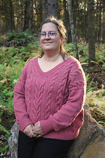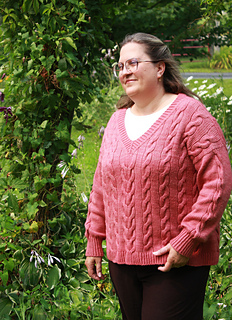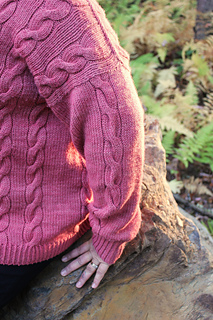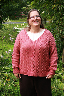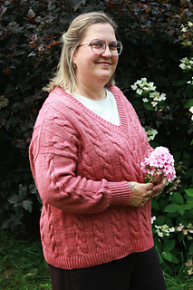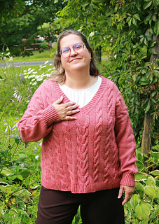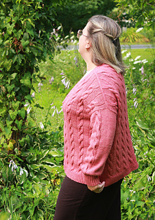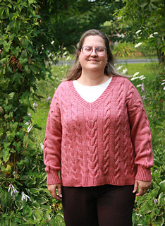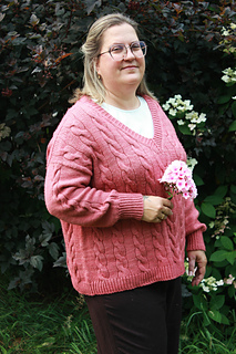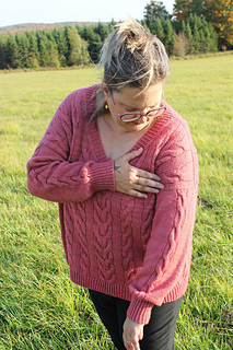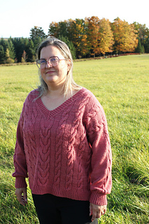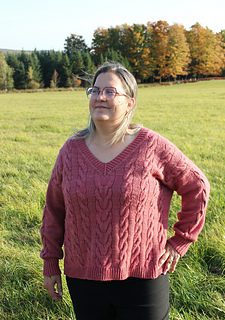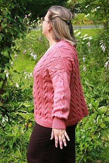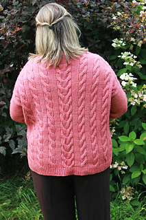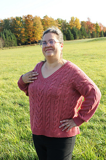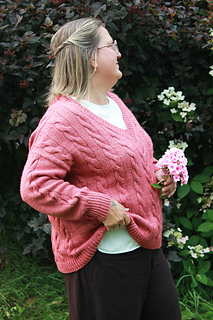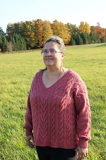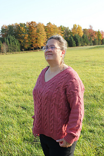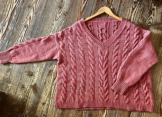 I designed this sweater with beautiful cables that cover the body and meet in the center, along with a cable running down the full length of the sleeves.