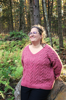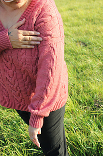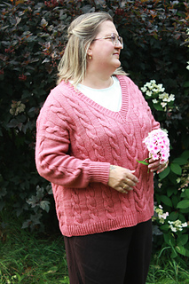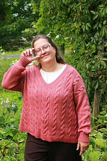The yoke features a simple construction: you start by casting on the back, then pick up stitches at the shoulders to create the V-neck at the front. Next, you knit the body in the round and finish with the sleeves. The sweater is knitted top-down.