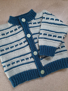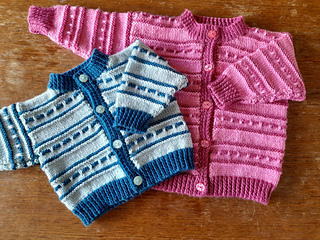Baby and toddler cardigans, knitted in one piece to the armhole. Ribbon effect created by slipped stitches.