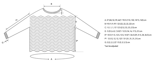 Designed to be worn with 6–12” / 15–30 cm of positive ease.