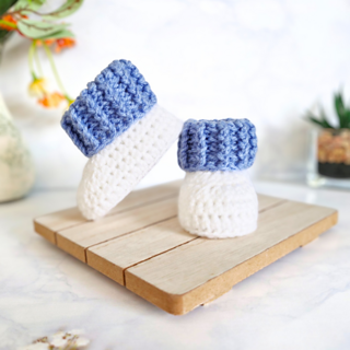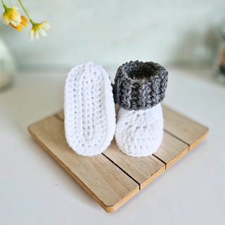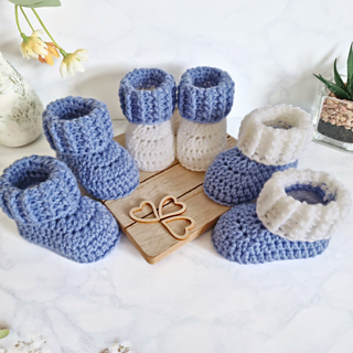 This pattern creates a pair of ridged cuff baby booties, they are bade in one piece from the sole up.