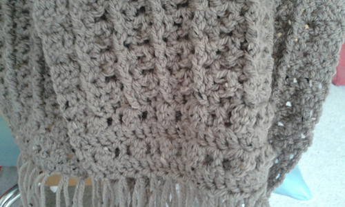 This pattern is to make a wide scarf with ridges running vertically, achieved through front and back post crochet. The width can be changed by altering the starting ch by multiples of 8 and changing the number of repeats in rows 2, 3, 6, 7 and 8. The length can be altered by changing the number of repeats of rows 7 and 8.