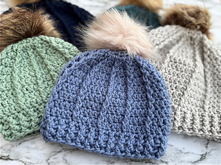 The Ridgeline hat is a crochet hat pattern in 5 sizes from baby-adult. It has raised lines running from top to bottom all the way around the hat made with post stitches. Finished off with a post stitch ribbing around the bottom and an optional faux fur pom pom.