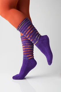 The elongated stitch (yarnovers worked on the first round and then dropped on the following round) gives this sock a simple but dramatic and elegant flair that makes it appropriate for anyone –especially in suitable colors, for a man’s sock. An easy variation would be to work 3–4 rows of the elongated stitch separated by solid sections. Instead, work 3–4 elongated rows at the top (or around the ankle). Have fun!