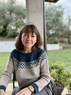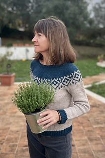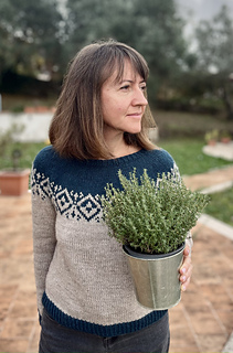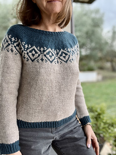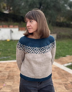 Like a landscape on the surface of a lake, the motif adorning the yoke of this sweater is mirrored and duplicated in the complementary colour. Riflessi is a circular yoke sweater knitted using the stranded technique. The simple colorwork motif makes it suitable for those approaching the stranded technique for the first time.