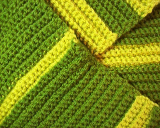The sample scarf is made using two colors, but you can make your scarf using one color, two, three or four or more colors if you like. Also, I like to change colors every 4-20 rows. You can change colors more frequently so that your stripes are more narrow or change colors less often for wider stripes. Just remember that the more color changes you make, the more ends you will need to weave in when you are finished. Also, I like to begin with one color, gradually making the first color rows narrower and the second color rows wider until I end with 24-36 rows of the second color (see Figure 2), so that you can reverse the scarf (turn it inside out) to display one or the other color.