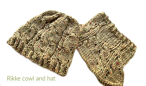 The Rikke hat matches the namesake cowl with the same two cable patterns, although worked in a different order. Knitted from the bottom up in the round. There is no bind off, you just cinch stitches together with tapestry needle and secure on inside of hat.