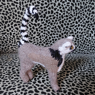 This 14 cm model was made on 2.5 mm double pointed (short) needles (UK 12.5, US 1.5) in Drops Lima (8903) black, (5310) taupe grey, (0619) beige and (1101) white. It can be done in scraps of any kind of yarn and double pointed needles. Soft toy filling is used to stuff the lemur. This is a fast, fun medium project, that requires flat and round knitting, color work, wrap and turns and short rows. There is some redistributing of stitches between needles and the facial features are embroidered.
