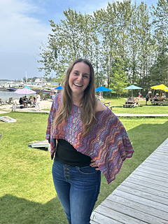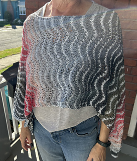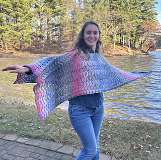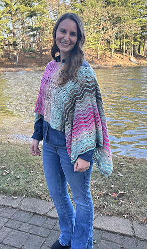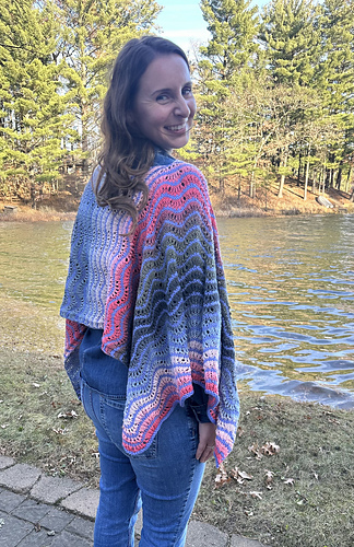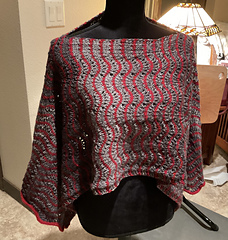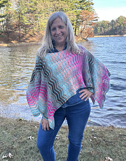 The Ripples Ponshawl is knit in a stitch design that undulates, just as in nature. Whether in rock formations or ripples on the water, nature’s beauty is represented in the ebb and flow of the stitch design. The Ripples Ponshawl is a cross between a poncho and a shawl. It is knit in one piece, with no seaming. It is an easy to wear wrap that has a beautiful drape, making it the perfect all year around accessory.