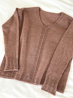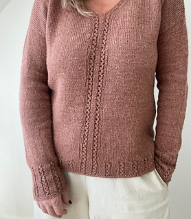 As with all V-necks, row gauge is important. If row gauge is less than 34 rows over 10cm/ 4”, the finished neck depth will be deeper than the Schematic indicates.
