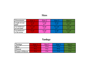 The pattern is graded for sizes 1–4 (see last picture for size chart and yardage). The gauge for the pattern in half double crochet stitches is 22 stitches x 15 rows (10 x 10 cm or 4 x 4 inches).
