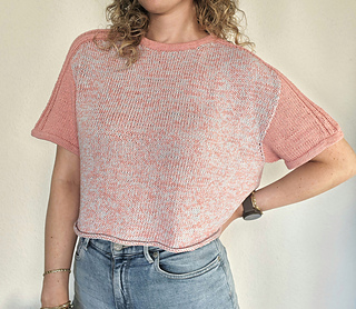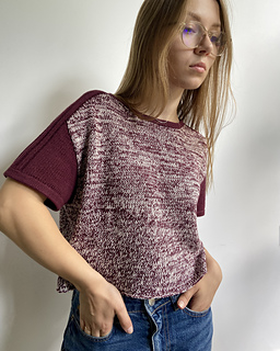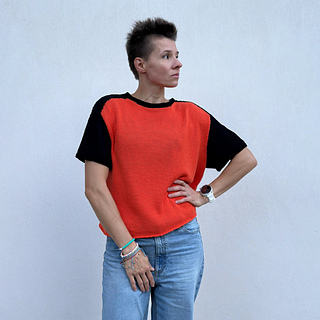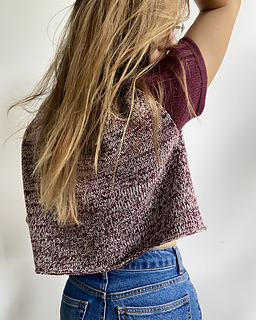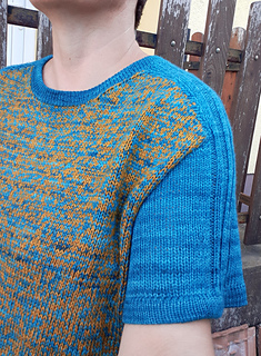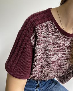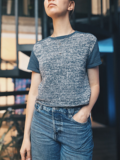Rival Tee is worked from the top down. First, two separate shoulder pieces are worked. Stitches are then picked up along one edge of each shoulder piece to work the back yoke, which is shaped using short rows. Then again, stitches are picked up along the opposite edge of the shoulder pieces to work the front yoke, shaped using short rows while simultaneously shaping the neckline. Once the front and back yokes are complete, they are joined at the underarm, and the body is worked in the round. The sleeves are worked from the top down in the round and shaped using short rows. Finally, the neckline and sleeve cuffs are finished with applied double edge, which is worked in stockinette stitch using a single strand of yarn.