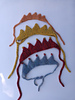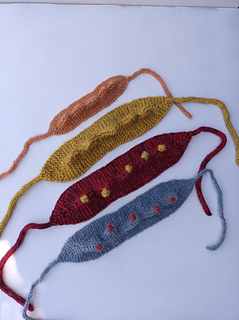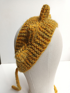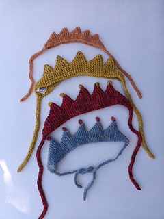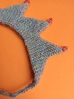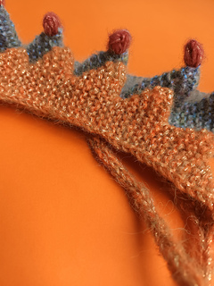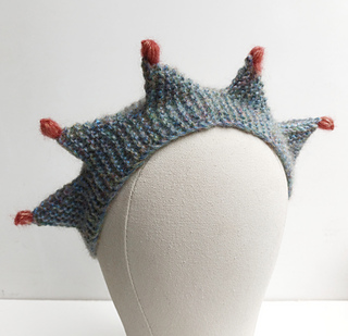 This pattern creates a one-piece knit headband featuring five Crown Peaks.. The band uses symmetrical increases and decreases to transition smoothly from the narrow I-cord ties to the final width.