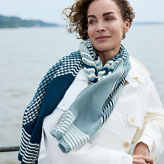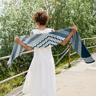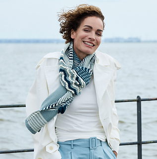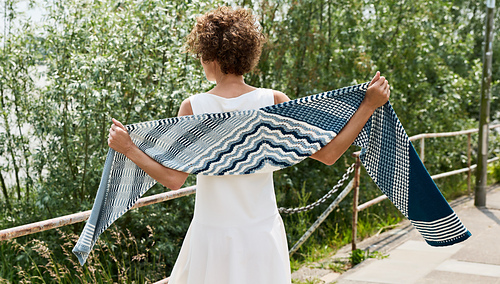 Riverlines begins with a central triangle of gently undulating stripes accented with lace elements. From the live stitches of this triangle, the scarf is worked outward to each edge, one side in a slip stitch pattern the other in a textured pattern, both featuring wide two-colour stripes. Short rows shape the end sections, forming the final rectangular silhouette. Finally, each end is crowned with a small eyelet pattern.