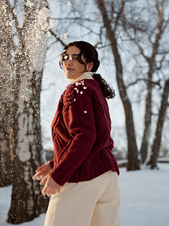 Sleeves can be worked using Magic Loop or optional DPNs in the same sizes. The bind-off used for the shoulder is an I-Cord Join. The 16” / 40 cm US 8 / 5 mm needle can be used to hold the front shoulder stitches.