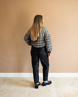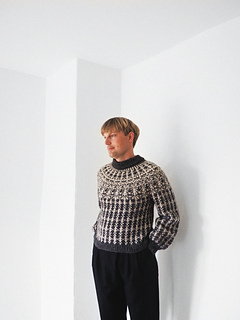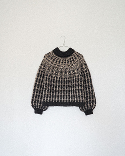 Method: The sweater is knitted top-down in the round in Stockinette Stitch, with a rounded yoke and rib edges. When knitting the yoke, body, and sleeves, a set of charts is worked in order to create the multicolored pattern.
