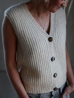 The Robin Vest is worked top down with fisherman’s rib. First the back piece is made, then stitches are picked up for the right and left shoulder. These three parts are put together at the end to create the body. The body is worked back and forth with fisherman’s rib and finally stitches are picked up at the armhole for a narrow, twisted ribbing edge and along the two front pieces for a nice, twisted ribbing edge/button band with buttonholes for 4 buttons.