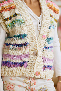 Main Color (MC): Spun Cloud (100% wool; approx. 100 yds (92 m) / 200 g) used throughout the vest and on the collar and all ribbing