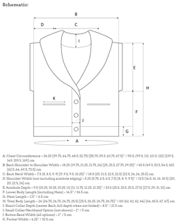 36.25 (39.75, 44.75, 48.5, 52.75) 55.75, 59.5, 63.75, 67.5” / 90.5 (99.5, 111.5, 121, 131.5) 139.5, 149, 159.5, 169 cm finished lower body circumference (buttoned)