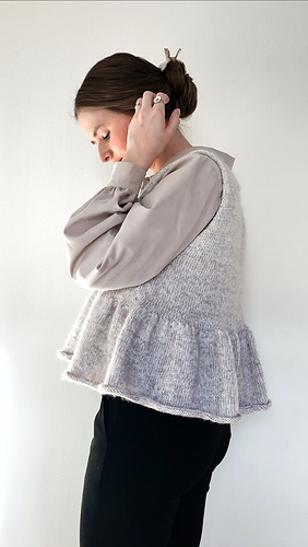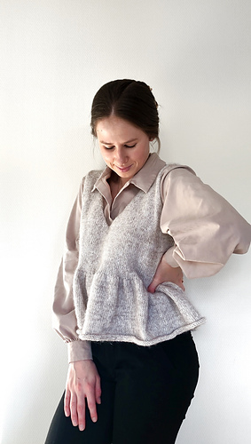 The top is knitted in two threads: one thread Baby Merino and one thread Kid-Silk, both by Drops. These will give the top the nice finish and give the top that cozy feeling that every nice top should have. It will of course be possible to replace the yarn but pay attention on hitting the same gauge as indicated in this pattern.