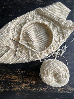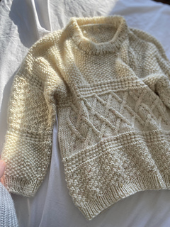 First the back yoke is knit back and forth. The shoulders are then attached individually to the back yoke and joined together to form the front. The front yoke is worked back and forth, until the front and back are joined. Once joined, the rest of the body is worked in the round. The neckline is then worked, by picking up stitches around the neckline and working ribbing until folding over to create a chunky effect. The arms are worked individually by picking up stitches around the armholes and working decreases towards the cuff.