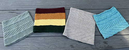 Your stitch patterns will be determined by rolling dice. This will result in a cowl that is unique. There are 6 x 6 or 36 possible stitch combinations for each section. Assuming you don’t repeat the same sequence in 2 sections, there are 36 x 35 x 34 x 33 = 1,413,720 possible resulting cowls. You may not knit them all, but I couldn’t stop at just one.