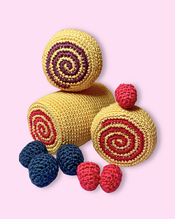 This roll cake crochet pattern is a digital PDF pattern to make your own miniature Swiss roll topped with raspberries and blackberries. Perfect for play food collections, bakery decor, or handmade gifts.