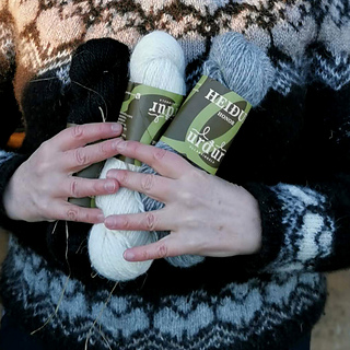Used in sweater sample: Heiður (Honor) from the Urðurull minimill, 100% wool, pure Icelandic lambswool from the farmers in Búðardalur (west of Iceland), Aran weight, 2 ply, 100 g = approx. 200 m / 218 yds