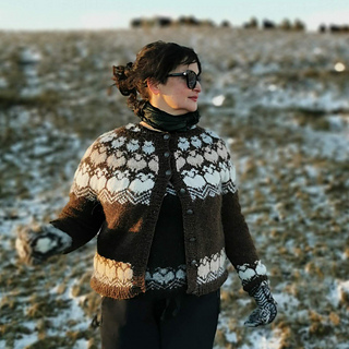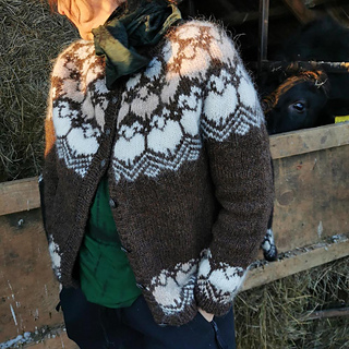 The cardigan was knitted with Léttlopi from Ístex, 100% new wool, Aran weight, unspun, 50 g skein = 100 m / 109 yds