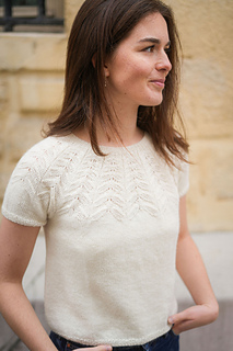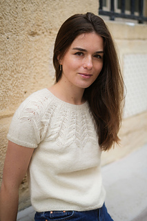 OVERVIEW: Romane tee is a light, effortless short-sleeve top featuring an elegant lace pattern worked across the yoke. Knit it in Sunny Linen for a crisp, breathable summer version, or in Honey Alpaca for a softer, warmer feel.