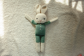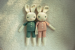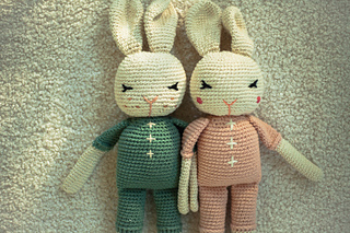 I have used several different cotton blends for this bunny, one of my favorites is “Pima Suprema” from Hobby Lobby (a 4/medium weight) - with which I used a size F hook (this produces a bunny measuring 16 ½” from ear-tip to toe). The Pima Suprema is a 180 yard skein, you will need only one skein of each color (You will use over half of the body color, and around half of the romper color). Just keep in mind when selecting your fiber that it will need to have a decent body to it or your ears will be floppier-which still could be totally cute!